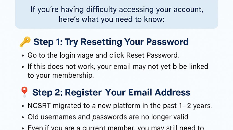 ✨ Tip: The most common login issue is that members have not yet registered their email address with the new system. Once you do, your membership will connect, and you’ll be able to log in successfully.